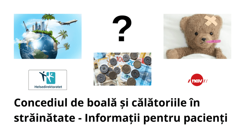 Poți însă să călătorești în străinătate dacă îți iei zile libere (avspassering) pentru zilele pe care ar fi trebuit să le muncești, dar dacă ieși în afara spațiului UE/SEE, va trebui să depui cerere la NAV pentru zilele în care ești în concediu medical. Medicul nu are posibilitateea să îți majoreze gradul de boală ( de exemplu de la 50 % la 100 %) pentru ca tu să poți călători în străinătate. Singura excepție sunt călătoriile aprobate pentru tratament (boli reumatice și psoriazis).